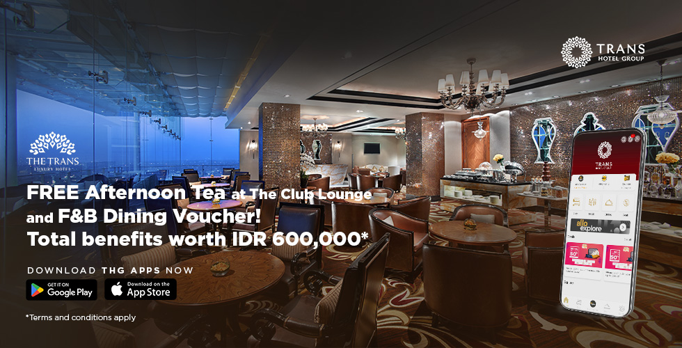 Make a reservation using Trans Hotel Group Apps to get the Best Rate Guarantee along with additional benefits such as FREE Afternoon Tea at The Club Lounge and F&B Dining Voucher --- in total worth of IDR 600,000 to dine with your loved ones at The Trans Luxury Hotel!