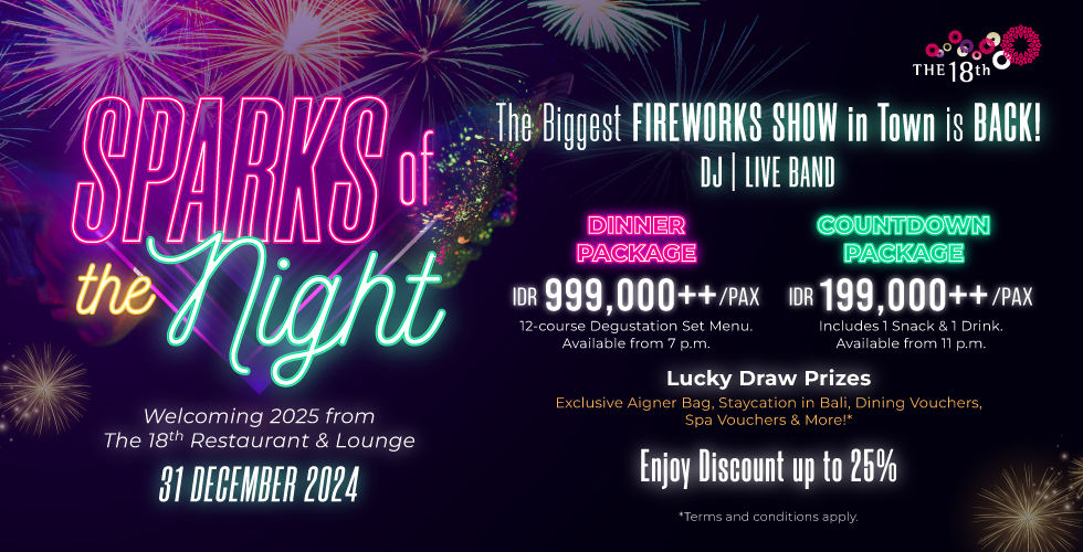 As the year draws to a close, elevate your celebrations at The 18th Restaurant and Lounge! Indulge in an exquisite set menu dinner as you overlook Bandung’s breathtaking skyline and prepare to welcome the new year in style! Join us on the 18th floor for a memorable evening of greatest dining experience, festive ambiance, and the city’s best view of the fireworks!